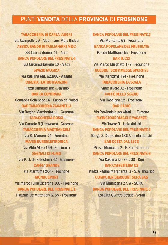 Per prevendite e punti vendita in provincia di Frosinone, potete consultare le pagine della brochure qui sotto.